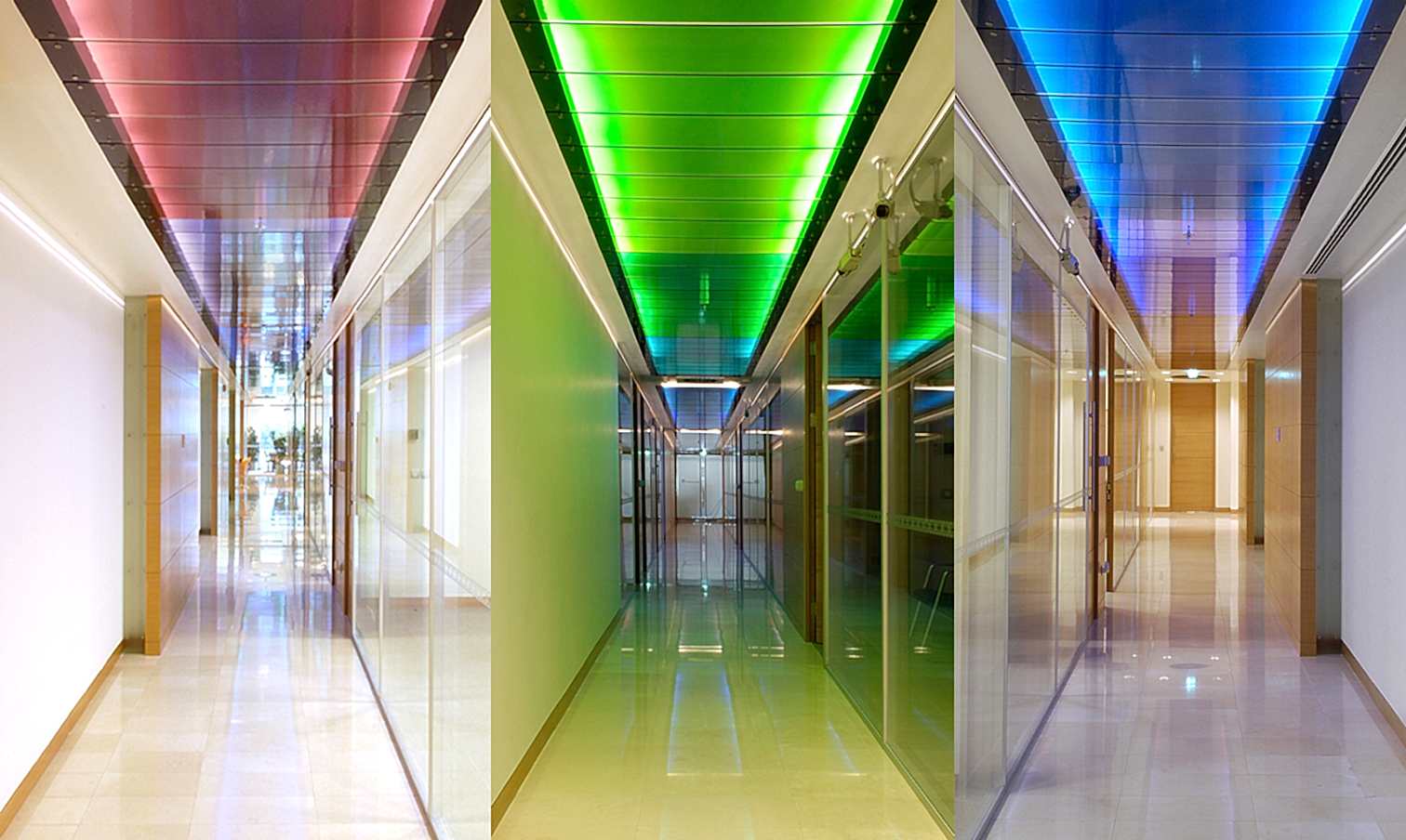 Restricted daylight and view of the exterior at this level has led GMWM to adopt more of an introverted design. The finishes are generally light and bright, and the partitions are predominantly glazed. The two main corridors with multi-colour glass ceilings are the main focus of attention.